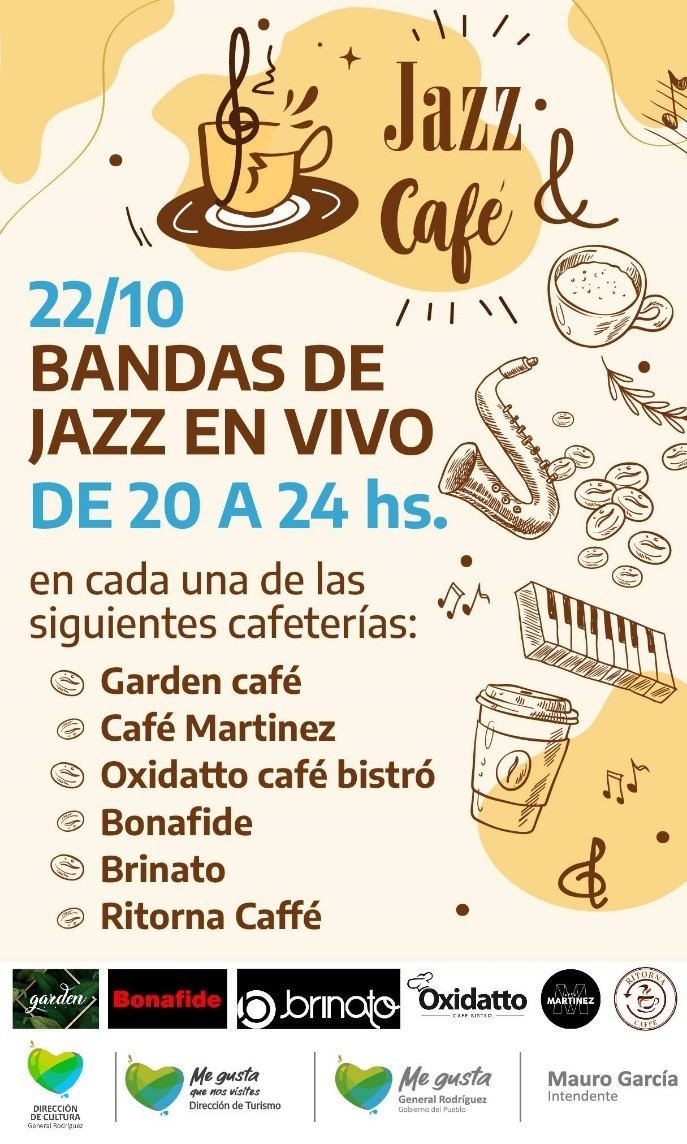 Este próximo viernes 22 de octubre se podrá disfrutar del “festival Jazz y Café” que se llevará a cabo en distintas cafeterías de General Rodríguez, por iniciativa de la Dirección de Cultura para dar impulso a los artistas locales, pero también para fomentar la actividad del sector gastronómico tan golpeado en contexto de pandemia.