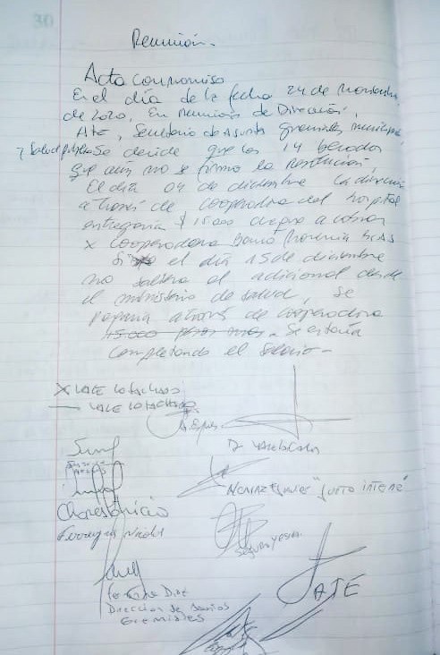 El acta compromiso firmada estableció que el 4 de diciembre se hará efectivo un pago de 15 mil pesos a través de la Cooperadora del Hospital, y si el 15 de diciembre no saliera el adicional desde el Ministerio de Salud de la Provincia de Buenos Aires, por planilla suplementaria, se les estaría abonando un salario a través de la Cooperadora.