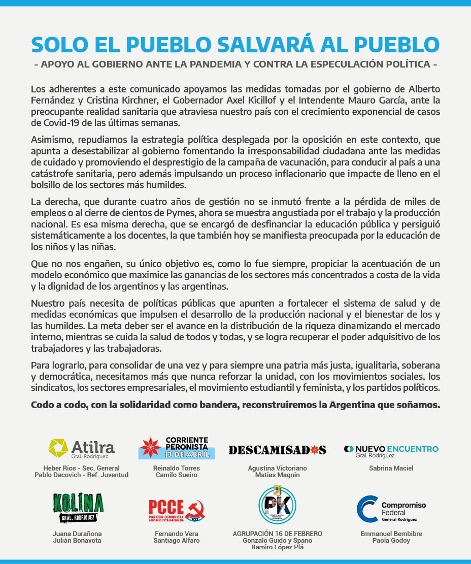 En el día de hoy, diversas organizaciones políticas y sindicales de General Rodríguez, con anclaje nacional, emitieron un comunicado en apoyo a las medidas sanitarias tomadas por el gobierno de Alberto Fernández y Cristina Kirchner, el Gobernador Axel Kicillof y el Intendente Mauro García.