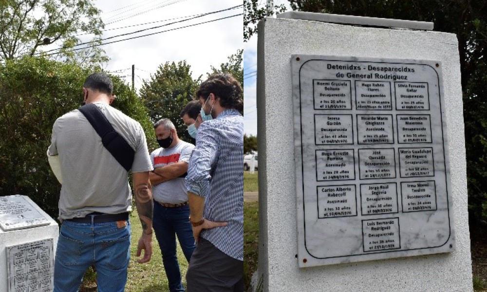 En el monolito que recuerda a Noemí Graciela Beitone, Juana Benedicto Maiorano, María Guadalupe del Reguero Sánchez, Silvia Fernanda Gallart, Miguel Ángel Hoyos, Jorge Raúl Segovia, Hugo Ernesto Perrone, José Quesada Maestro, Hugo Ruben Flores, Teresa Garzón, Ricardo Mario Ghigliazza, Irma Noemí Tardivo y Carlos Alberto Rabecoff, Vecinos y vecinas de General Rodríguez que fueron victimas de tortura, secuestro y desaparición forzada, Sueiro llamó a redoblar el esfuerzo para transformar la realidad del pueblo, esa que las fuerzas armadas impusieron a sangre y fuego, y por la que lxs 30.000 perdieron su vida.