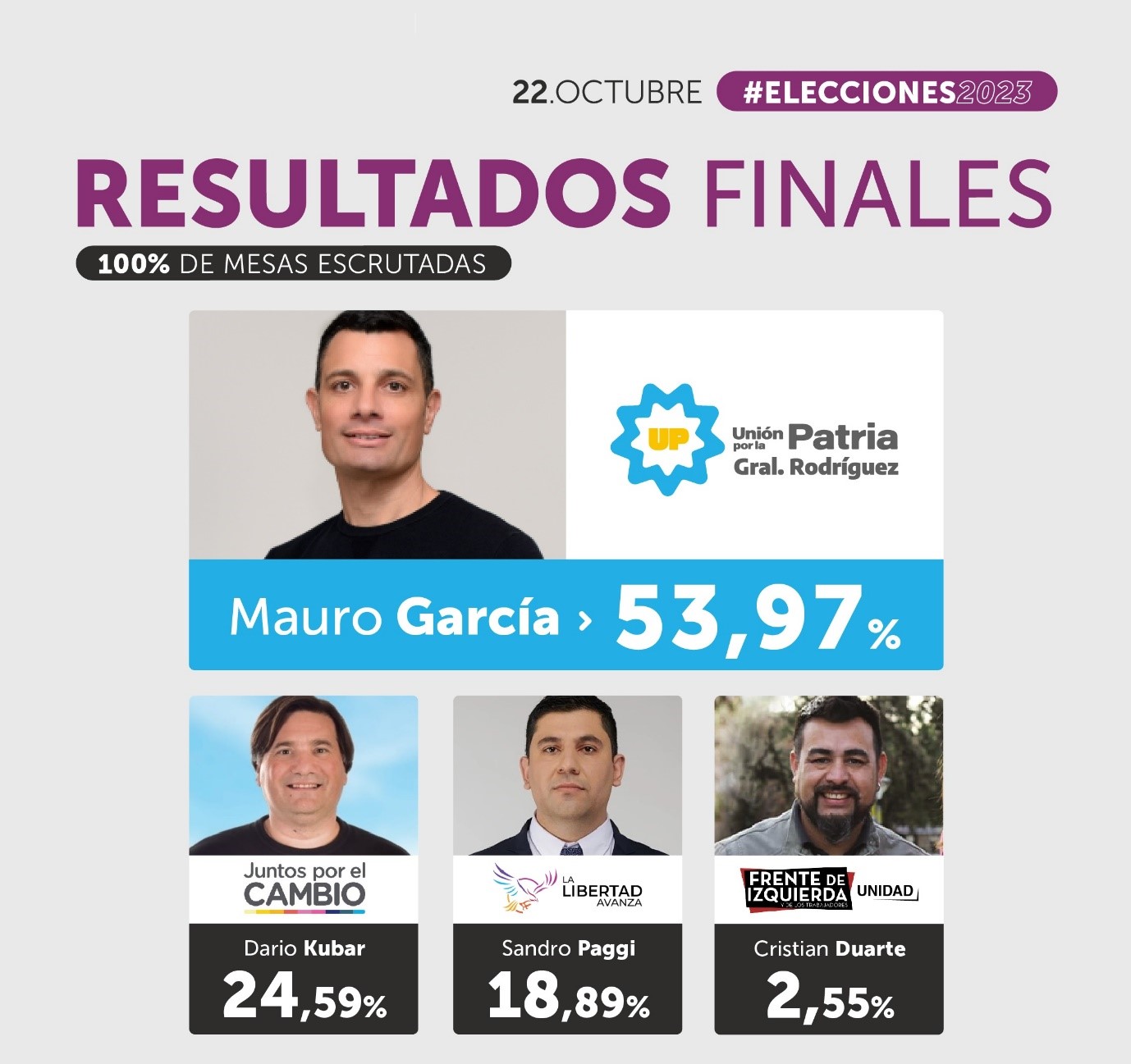 Con el 100% de las mesas escrutadas, en General Rodríguez Unión por La Patria alcanzó el 53,97% de los votos totales, habilitando así un segundo mandato de Mauro García, pero además una ampliación de su presencia en el Concejo Deliberante ya que mejoró su performance respecto a la elección anterior, así como también la del candidato a gobernador Axel Kicillof que fue votado por el 49.77% de las y los rodriguenses y la del candidato a presidente Massa que registró cerca de un 46.53%.