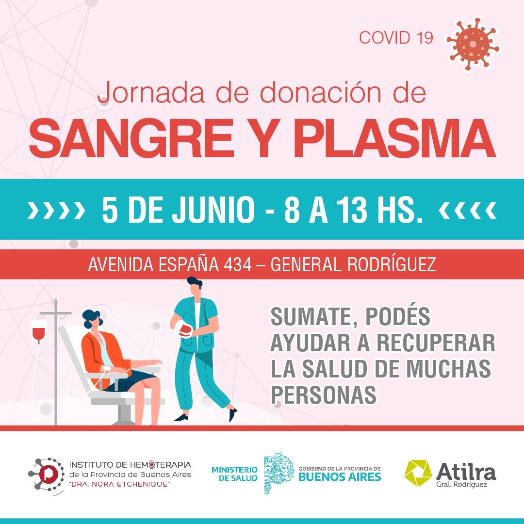 Producto del acuerdo que Heber Ríos, Secretario General de Atilra Seccional General Rodríguez, firmó con la Región Sanitaria VII de la provincia de Buenos Aires para llevar adelante acciones sanitarias conjuntas en el territorio, en el marco de lucha contra la Pandemia de Covid-19; se realizará el próximo 5 de junio una jornada de donación de plasma y sangre en el CFP de Atilra (Av. España 434).