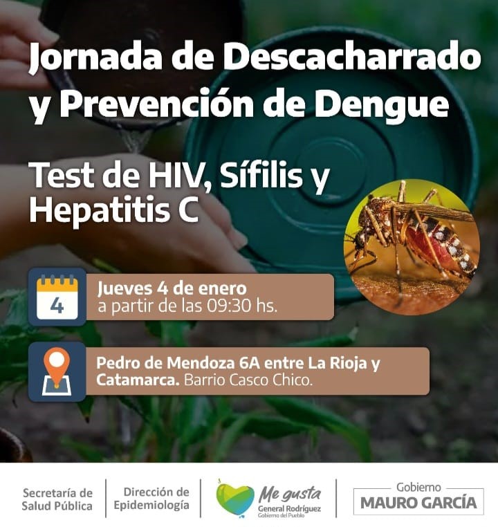 La actividad se llevará adelante el jueves 4 de enero a partir de las 9:30 de la mañana en Pedro de Mendoza 6ª, entre La Rioja y Catamarca, barrio Casco Chico, y la organiza y realiza la Dirección de Epidemiologia del gobierno de General Rodríguez en conjunto con el Ministerio de Salud de la Provincia de Buenos Aires.