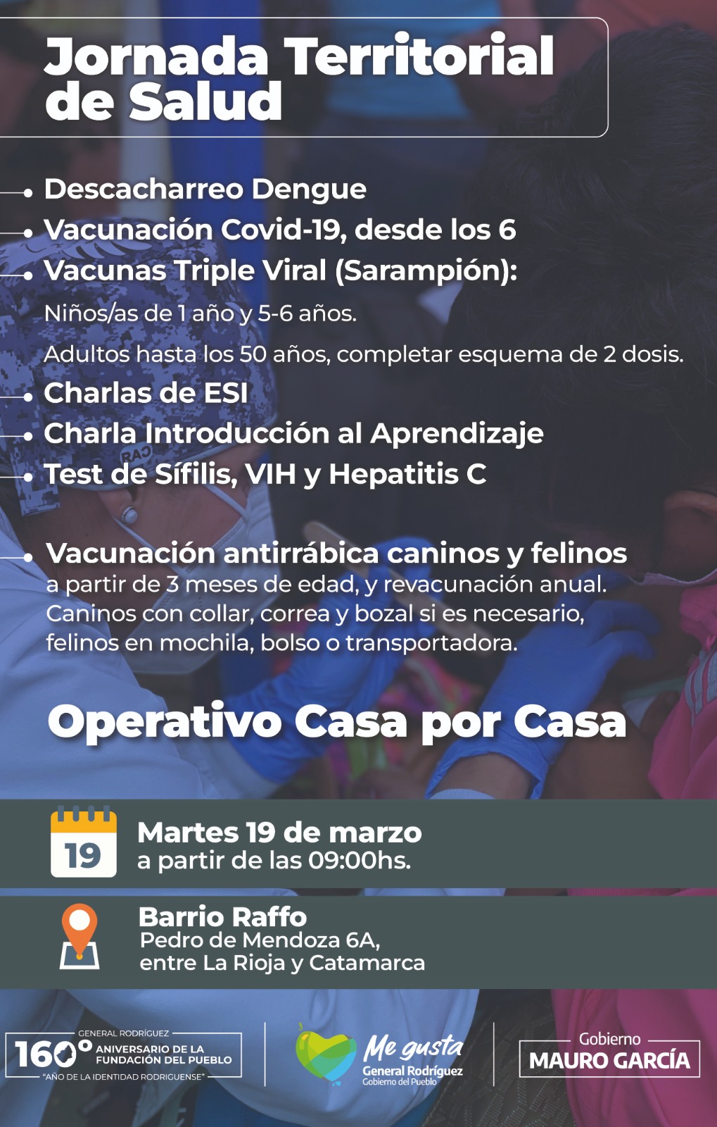 El martes 19 de marzo, a partir de las 9 horas, el gobierno municipal, encabezado por el Intendente Mauro García, realizará una nueva Jornada Territorial de Salud esta vez en el barrio Raffo.