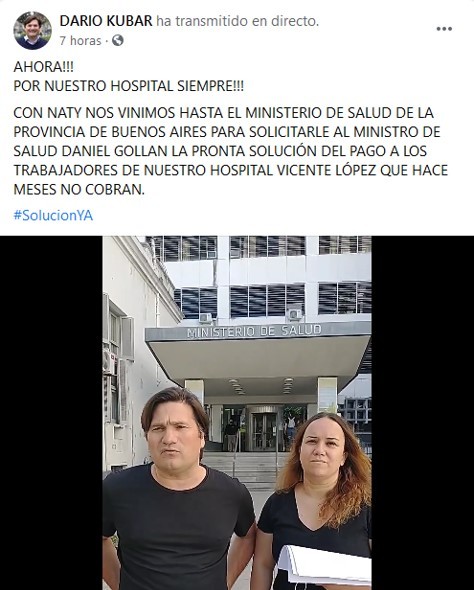 Aprovechando políticamente la situación que atraviesan, hoy por la mañana el ex intendente de General Rodríguez, Darío Kubar, y su esposa la concejala Natalia Ruiz montaron una opereta en la puerta del Ministerio de Salud, donde expresaron que estaban para reclamar por los pagos adeudado al personal del nosocomio.
