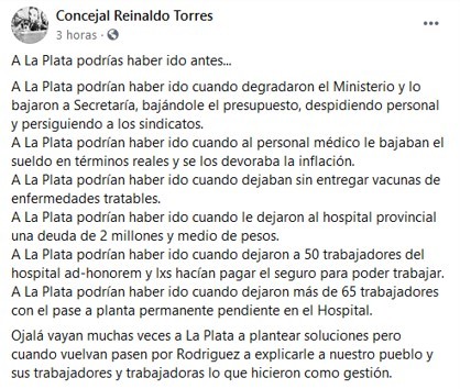 En un duro comunicado, el concejal Reinaldo Torres, jefe del Bloque del Frente de Todos, les salió al cruce, y les recordó que pasó con la salud en el país, y principalmente en General Rodríguez, cuando ellos estuvieron en el gobierno.
