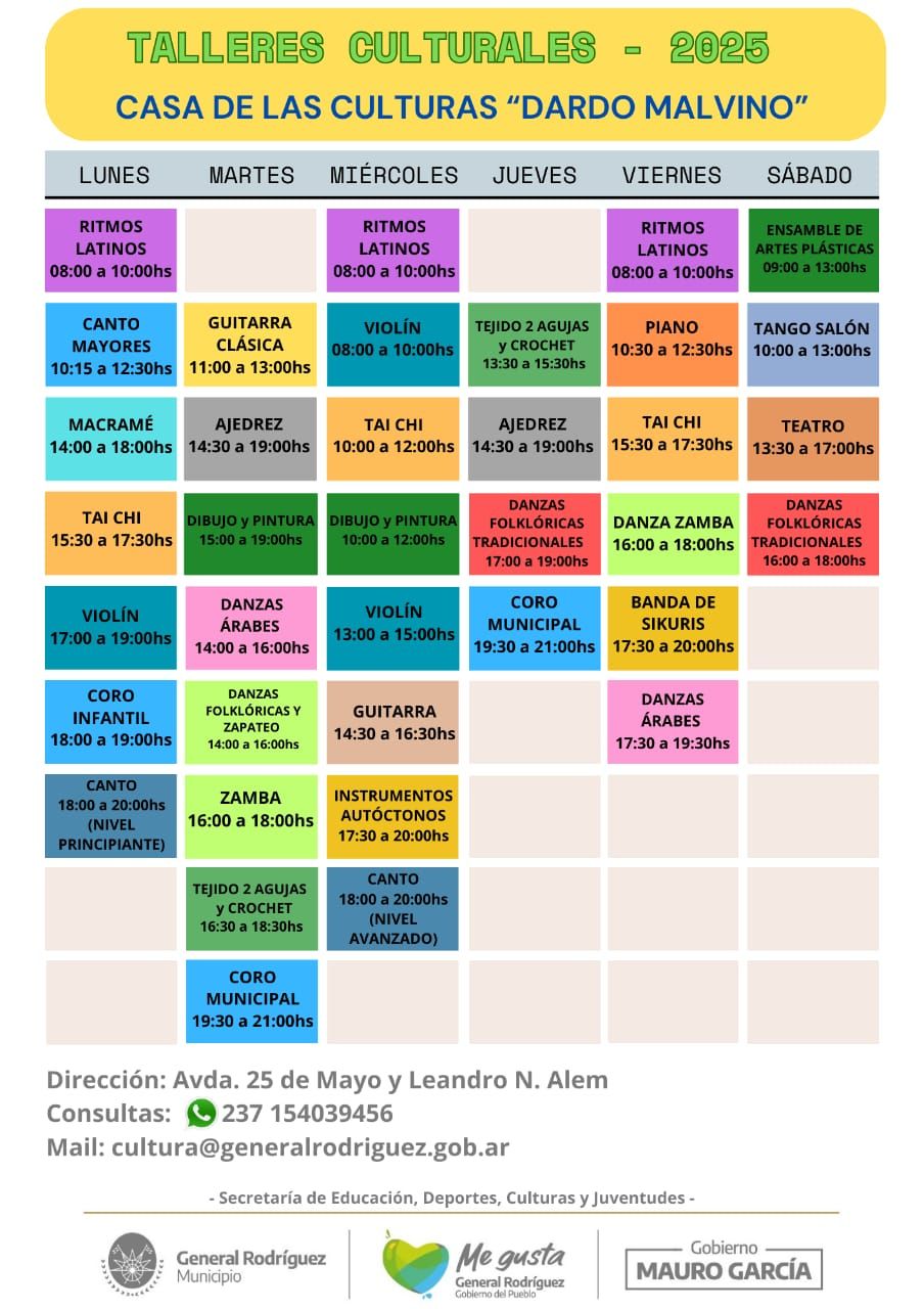 Desde la Secretaría de Educación, Deportes, Culturas y Juventudes anunciaron la apertura de los talleres de La Casa de las Culturas «Dardo Malvino», ubicada en el Polideportivo Municipal de General Rodríguez. Una vez más abre sus puertas para ofrecer una amplia variedad de talleres culturales gratuitos dirigidos a toda la comunidad, con el objetivo de fomentar el arte, la creatividad y el encuentro social.