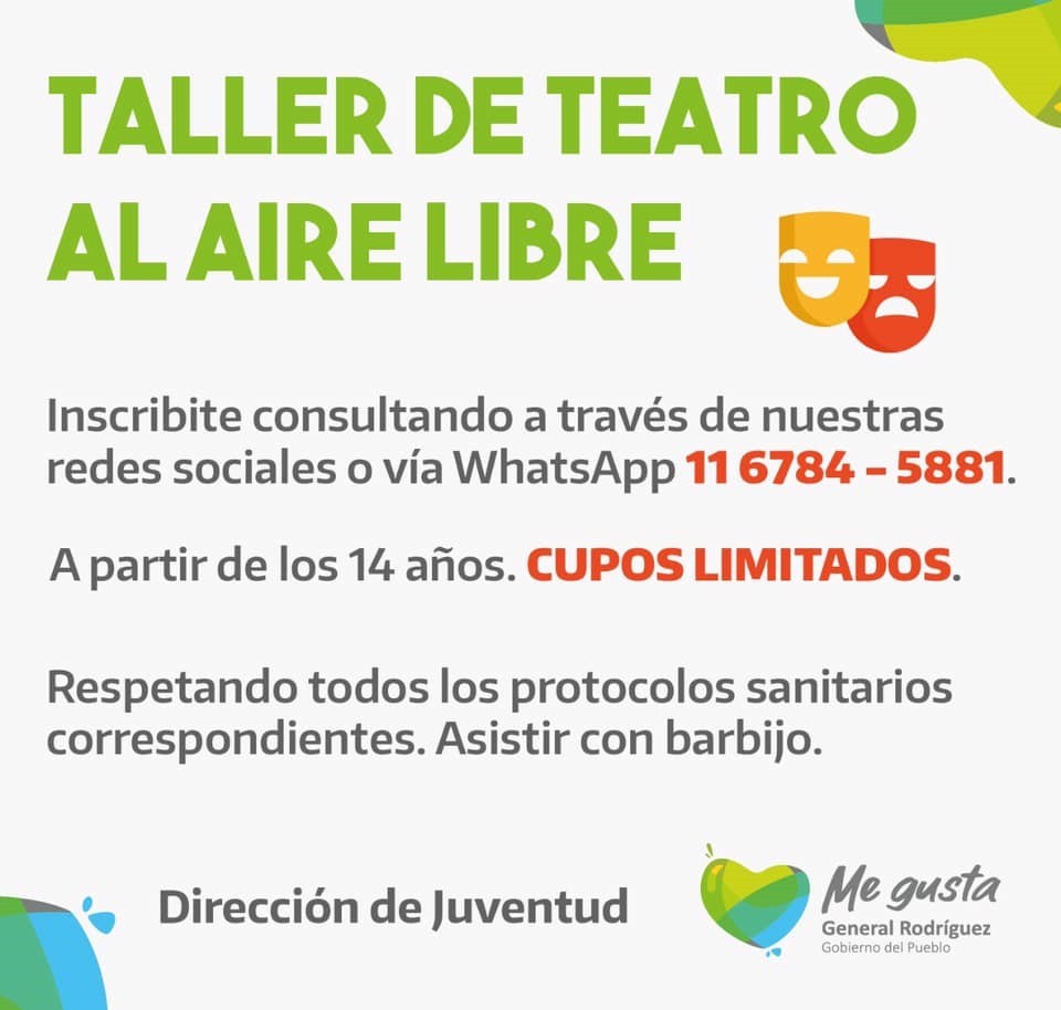 Desde la Dirección de Juventud de la Municipalidad de General Rodríguez, se lanzaron nuevos talleres gratuitos y abiertos a la comunidad, que iniciarán en las próximas semanas, con cupos limitados, teniendo en cuenta los protocolos sanitarios dispuestos ante la pandemia de Covid-19.