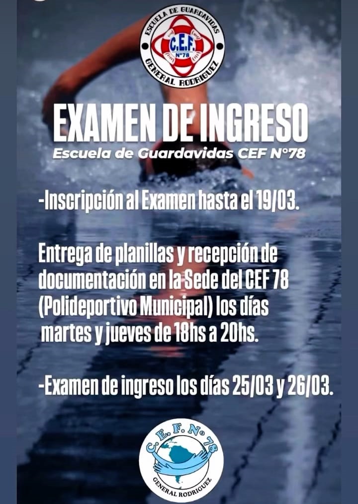 La Escuela de Guardavidas del CEF N° 78 de General Rodríguez anunció la apertura de la inscripción para su examen de ingreso correspondiente al nuevo ciclo formativo.