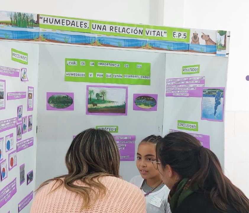 “Es importante destacar que el trabajo es de todo 4° C, de los y las 17 estudiantes y de las familias que acompañan un montón”, señaló Speranza. También resaltó que hubo una etapa inicial del proyecto que consistió en una campaña de concientización en la propia escuela, algo que destaco como una experiencia muy emocionante. “Los chicos y chicas pasaron por cada aula explicando el proyecto, pegaron carteles por toda la escuela, armaron stands con modelos explicativos sobre la función de los humedales en la naturaleza y se quedaron en cada recreo contando a todos los niños y niñas de todos los grados que se acercaban a observar y preguntar”, manifestó.
