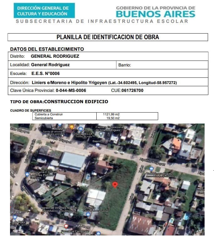 El miércoles 18 de enero el gobierno de General Rodríguez informó que el próximo 25 de enero se realizará la licitación para llevar adelante la construcción de un edificio propio para la Escuela Secundaria N°6.