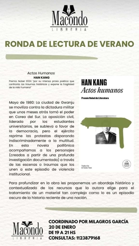 La librería Macondo llevará a cabo una nueva ronda de lectura, a cargo de Milagros García, acerca del libro “Actos humanos”, de Han Kang. La obra se trata de una antología de relatos ficcionalizados a partir de la exhaustiva investigación que hizo la autora sobre los testimonios de la Masacre de Gwangju de mayo de 1980. Este hecho fue la represión brutal de la dictadura de Chun Doohwan a una toma de las armas por parte de la ciudadanía que dejó un saldo de 165 muertos oficiales, pero que en realidad se dice que fueron muchos más de 1000.