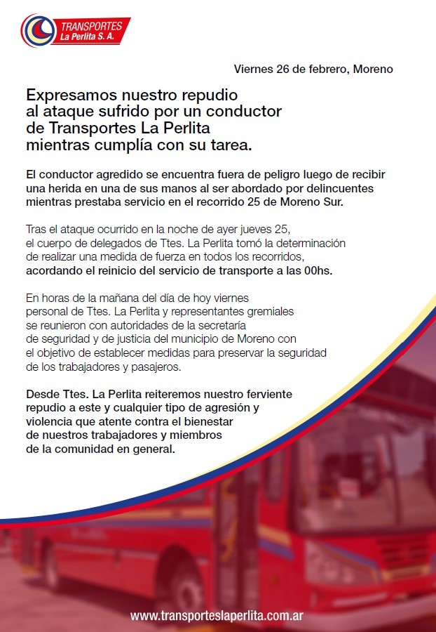 Hoy por la mañana La Perlita anunció que iniciaba una medida de fuerza tras un asalto ocurrido en Moreno en el cual resultó herido uno de sus choferes.