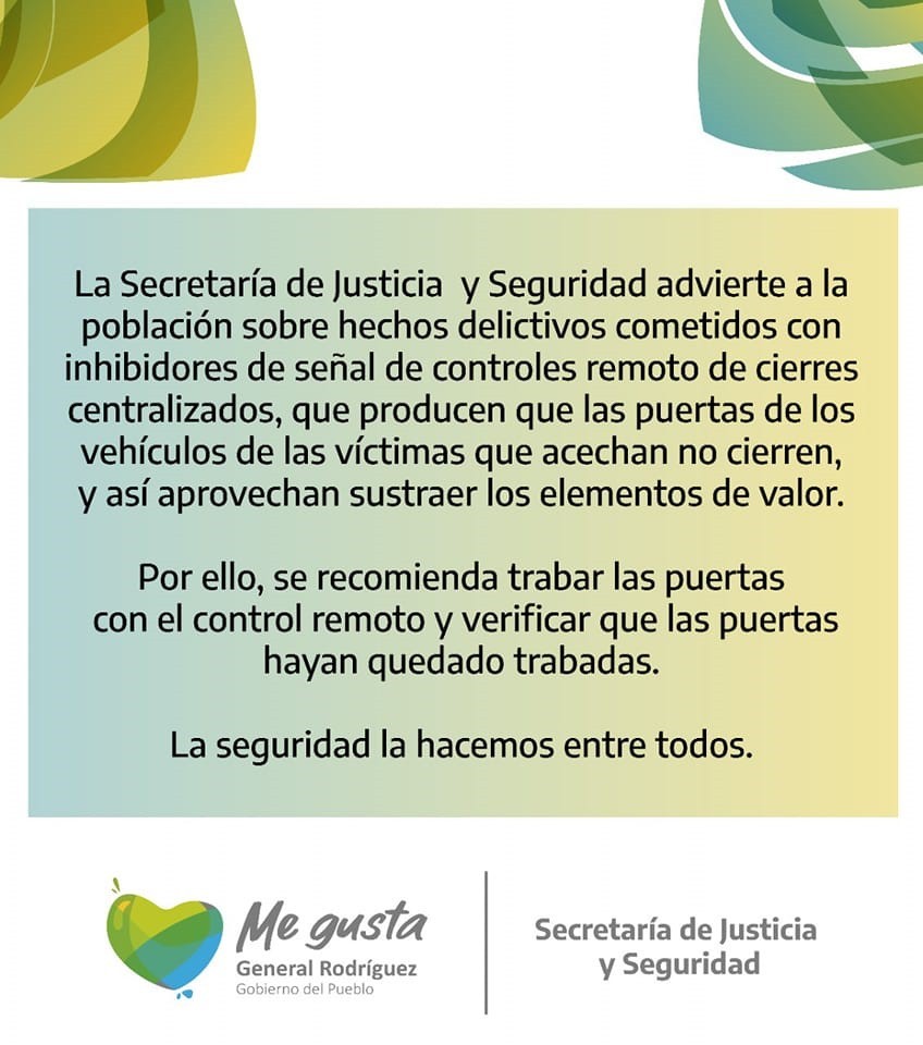 El día miércoles 16 de junio la Secretaria de Seguridad del Municipio, Ana Mottino nos contó sobre una nueva modalidad de robo de autos que se está practicando en General Rodríguez. Se trata de la utilización de inhibidores de señal de controles remoto de cierres centralizado.