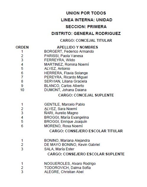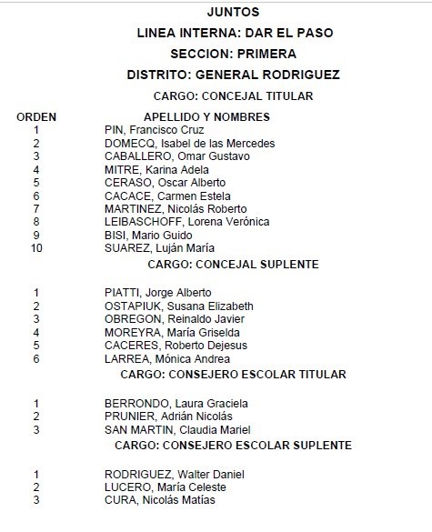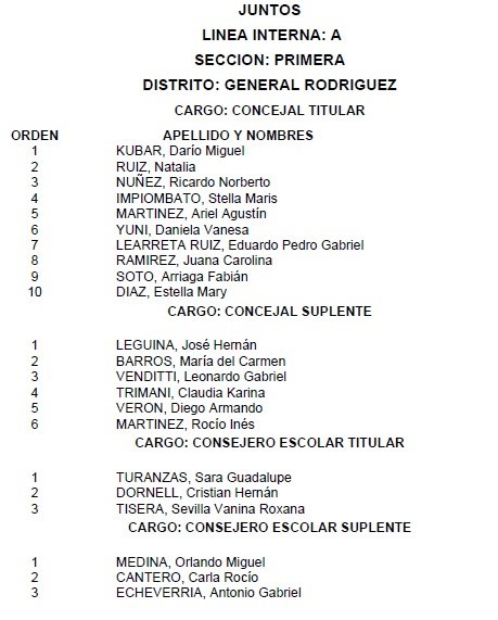 Este último es el caso por ejemplo de las listas macristas, que, ahora con el nombre de Juntos, presenta una lista encabezada por el ex intendente Dario Kubar, otra por el concejal radical conservador Francisco Pin y otra por Javier Costalonga.