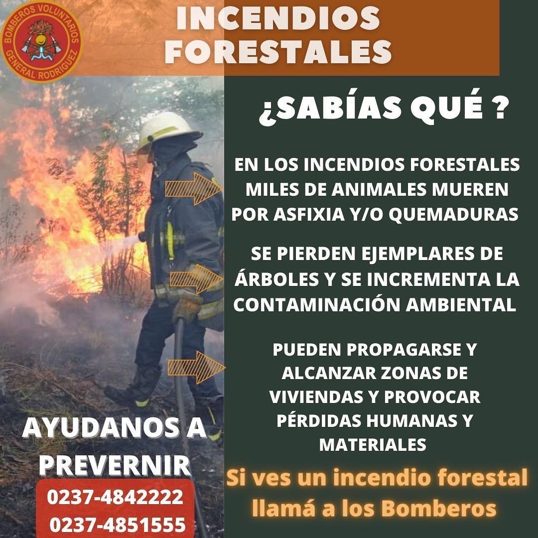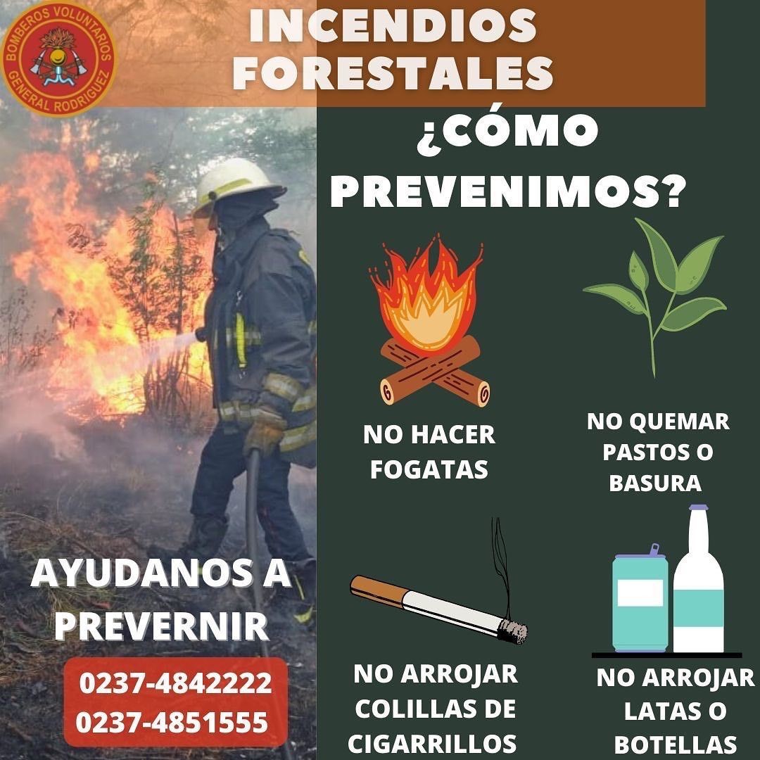 La página oficial de los Bomberos Voluntarios de General Rodríguez ha iniciado el trabajo de concientización hacia los vecinos y las vecinas del distrito. Según muestran las estadísticas, el 95% de los incendios forestales son producidos por la mano del hombre.