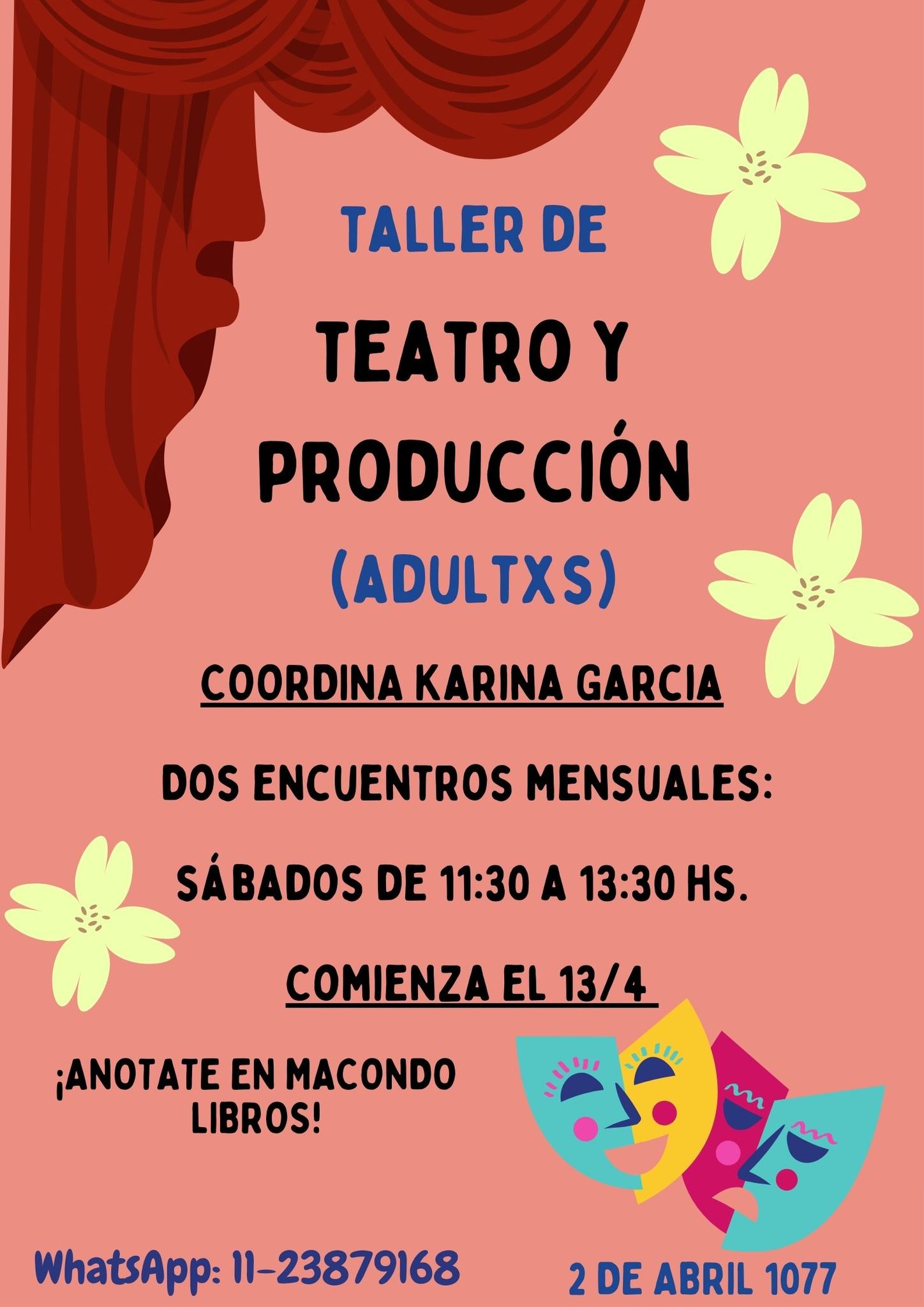 Taller de teatro y producción para adultos, el cual será coordinado por Karina García. El mismo tendrá dos encuentros mensuales los días sábados de 11:30 a 13:30hs, dando comienzo el 13 de abril.