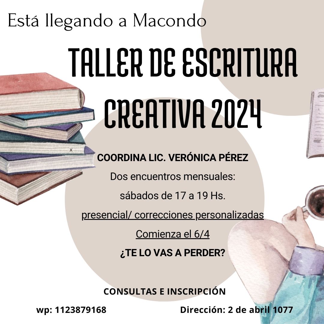 Taller de escritura creativa, coordinado por Verónica Pérez. Este taller tendrá dos encuentros mensuales los días sábados de 17 a 19hs y comenzará el 6 de abril. Será presencial con correcciones personalizadas.