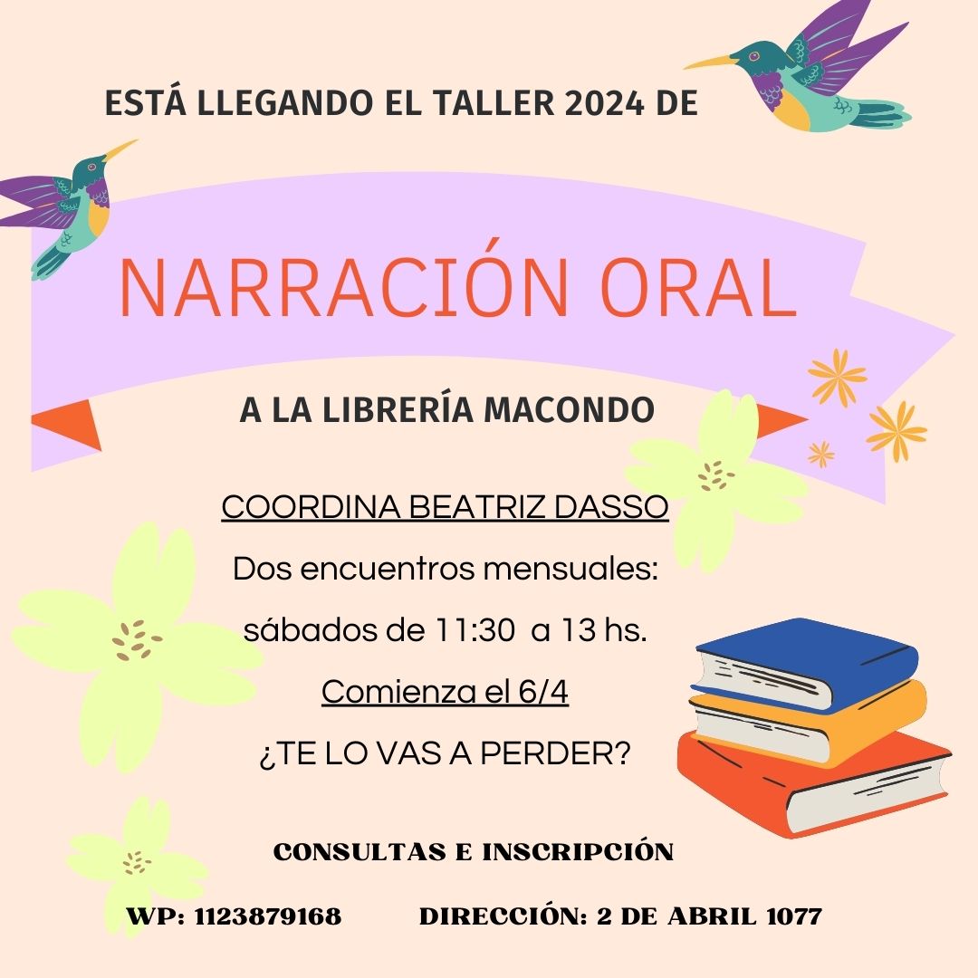 Taller de narración oral, coordinado por Beatriz Dasso. El mismo tendrá dos encuentros mensuales los días sábados de 11:30 a 13hs, comenzando el 6 de abril.