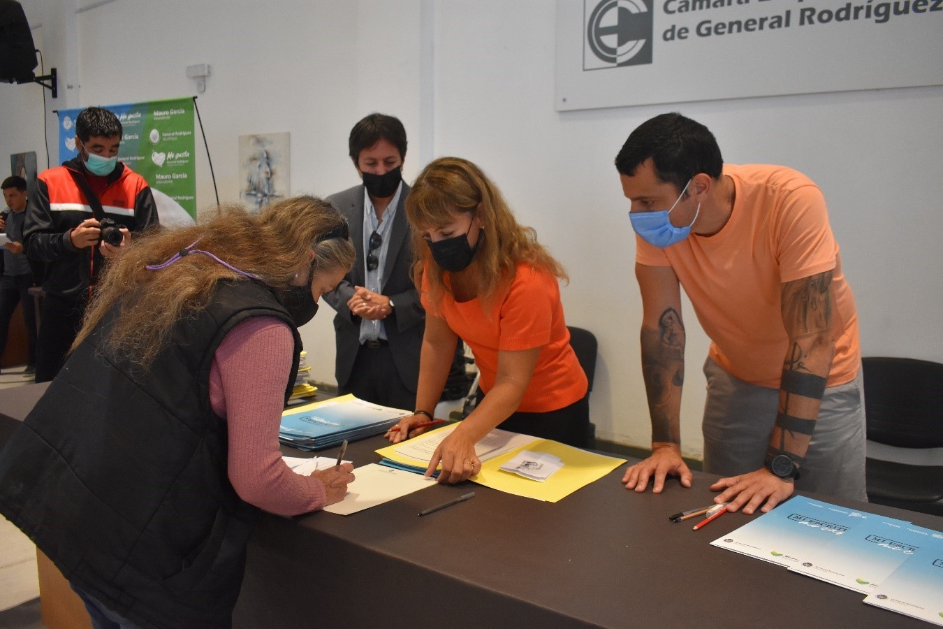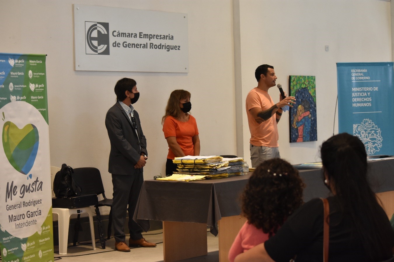 En el marco del programa “Mi escritura, mi casa” implementado por el gobierno de la provincia de Buenos Aires, este lunes familias de General Rodríguez firmaron sus títulos de propiedad. La jornada de escrituración se realizó a partir de las 10:30 horas, en la Cámara Empresaria ubicada en la calle Hipólito Irigoyen 366.