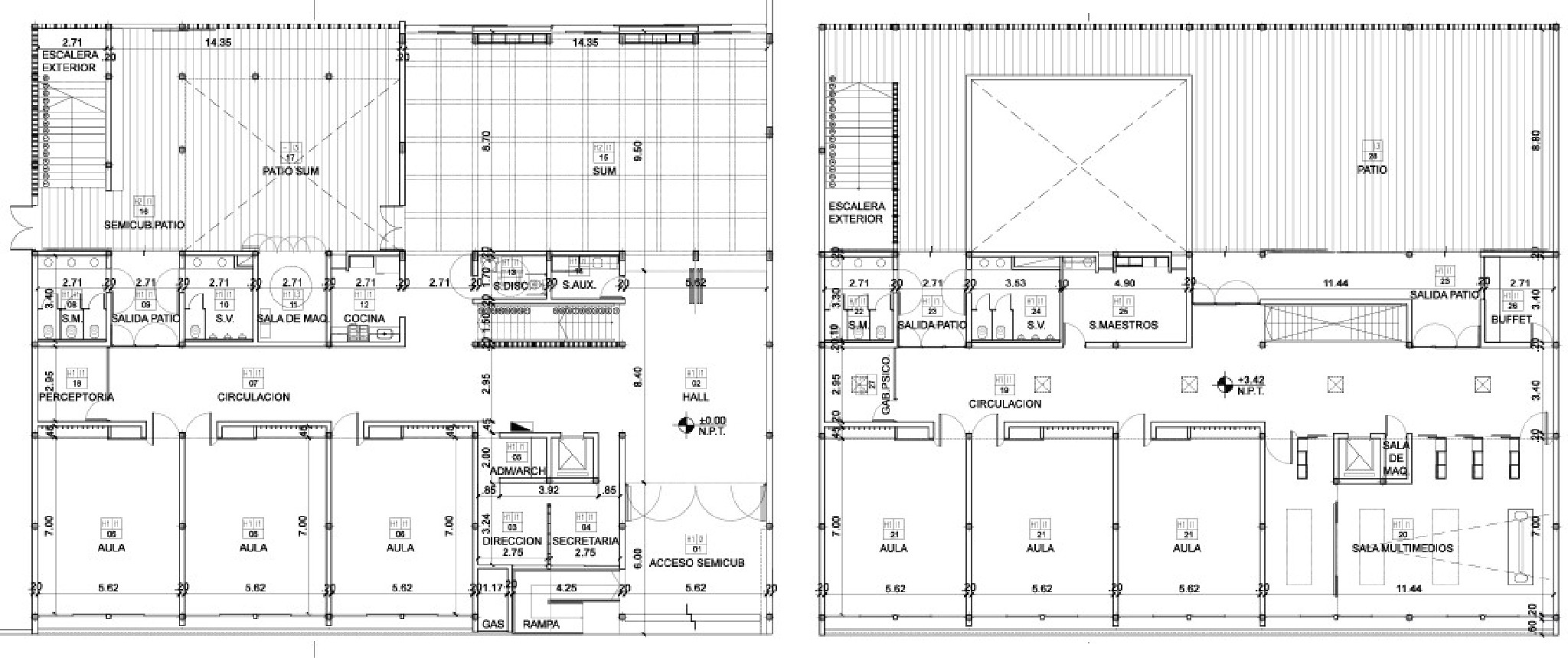 La planta baja tendrá 3 aulas, sum, oficinas de administración y servicios, y sanitarios. Además de un patio semicubierto. La planta alta 3 aulas, sala multimedios, sanitarios y administración.