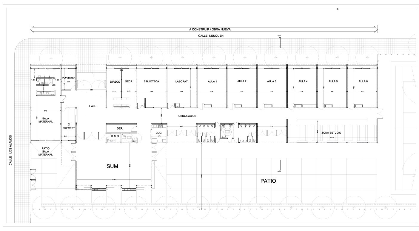 Estará ubicada sobre la calle Los Aromos. Tendrá una superficie cubierta de 1082.70 m2, y una superficie semicubierta de 68.40 M2. 6 aulas, sum, sala maternal con patio, deposito, preceptoría, portería, sala de auxiliares, cocina, biblioteca, área de estudio, laboratorio, son algunos de los espacios por los que estará compuesta.