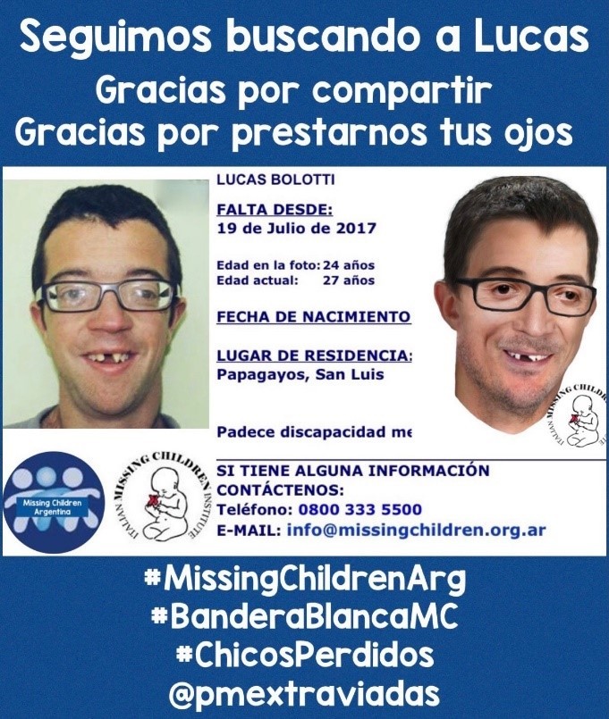 A casi cuatro años de ese día, sus familiares publicaron en redes sociales una actualización del rostro de Lucas realizada de forma digital por Missing Children, acompañada de vías de contacto ante cualquier probable información que se pueda tener (tel. 0800-333-5500 o al mail info@missingchildren.org.ar).
