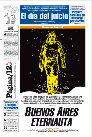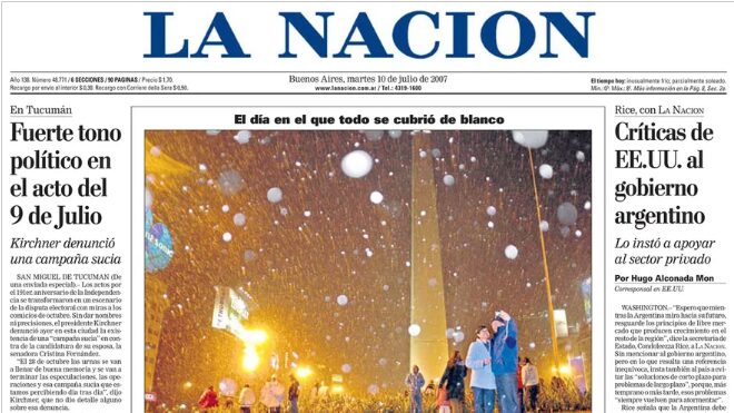 El 10 de julio las portadas de los distintos diarios se colmaron de imágenes y titulares que muchos atesoran en su caja de recuerdos. El diario La Nación titulaba «El día en el que todo se cubrió de blanco», mientras que Página 12 hablaba de la «Buenos Aires Eternauta», destacando que cincuenta años después de que Héctor Oesterheld imaginara una ciudad cubierta de nieve, la historia se hacía realidad. Por su parte, el periódico El Vecinal publicaba una crónica el 13 de julio donde mencionaba: “Cientos y cientos de vecinos salieron a festejar este rarísimo acontecimiento que muy pocas veces ha ocurrido por la posición geográfica de nuestro distrito”.
