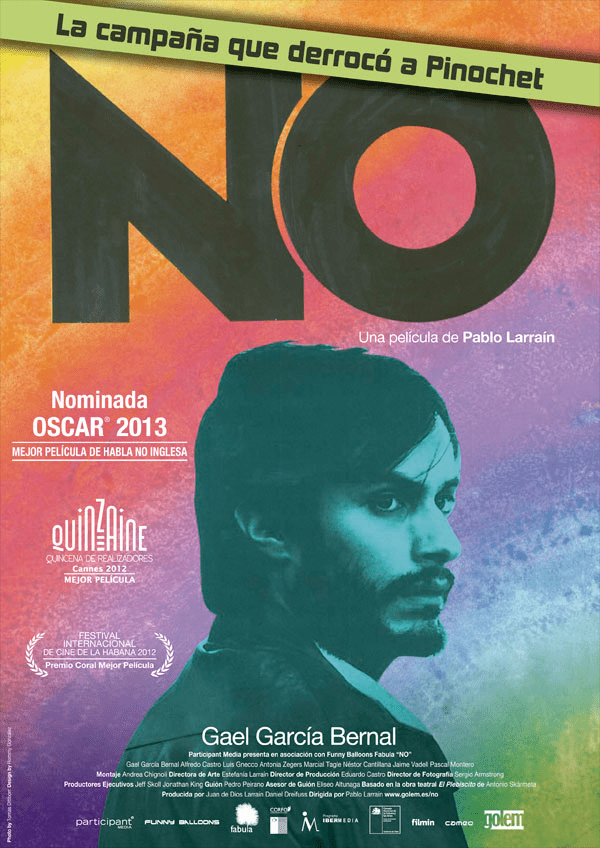 Pablo Larraín dirige la Película chilena NO, del año 2012 que cuenta la historia del plebiscito chileno de 1988 que pondría fin a la dictadura de Augusto Pinochet. Allí, el pueblo chileno tenía dos opciones: votar por el ¨sí¨ para extender el mandato del candidato único del gobierno, o votar por el ¨no¨ para convocar elecciones democráticas.