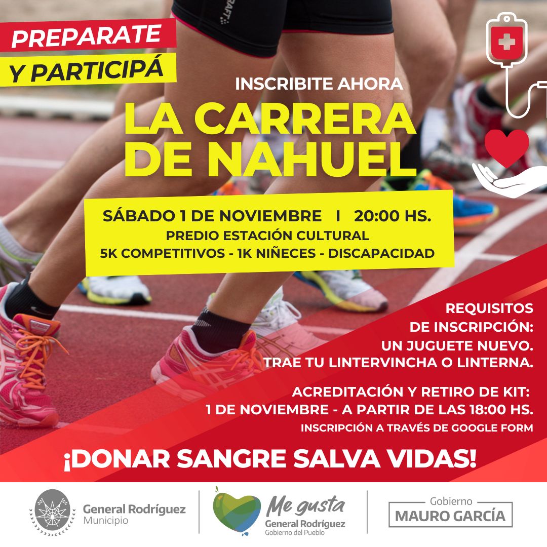 “La Carrera de Nahuel” es una propuesta que busca concientizar acerca del cáncer infantil y la importancia de la donación de sangre y médula ósea, con el fin de aumentar el número de donantes voluntarios que permitan a los pacientes diagnosticados con estas enfermedades, mejorar su calidad de vida y continuar con sus tratamientos. Además, tiene como objetivo recolectar donaciones de juguetes nuevos y útiles escolares que serán entregados a pacientes oncológicos de hospitales de la zona.