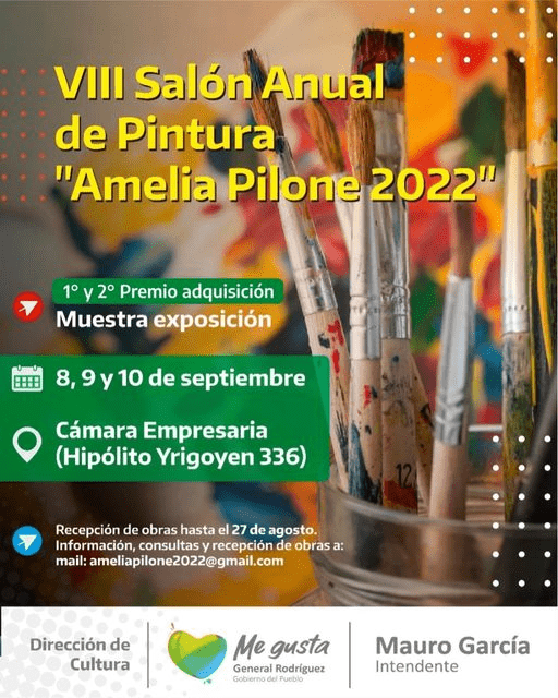 El municipio de General rodríguez, desde la Dirección de Cultura, anuncio que este año se llevara a cabo la octava edición del Salón Anual de Pintura Amelia Pilone. La misma es una muestra para aquellos artistas que deseen exponer hasta un total de dos obras. Si bien la temática del concurso es libre, existe una solo condición: que la pintura no exceda el metro y diez centímetros de ancho y de largo.