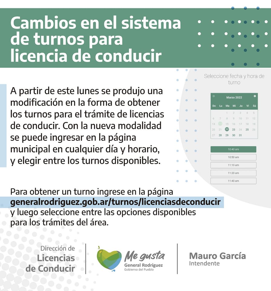 Desde finales del año pasado la asignación de turnos para hacer la renovación o tramitación del registro de conducir en General Rodríguez se realiza de forma únicamente online a través de la página https://generalrodriguez.gob.ar/tramites/licencias-de-conducir. Cada día, a partir de las 8 horas, cuando se renovaba la turnera, las personas podían ingresar al sistema y elegir uno de los turnos que se asignaban para el día posterior, hasta que se agotaban los cupos.