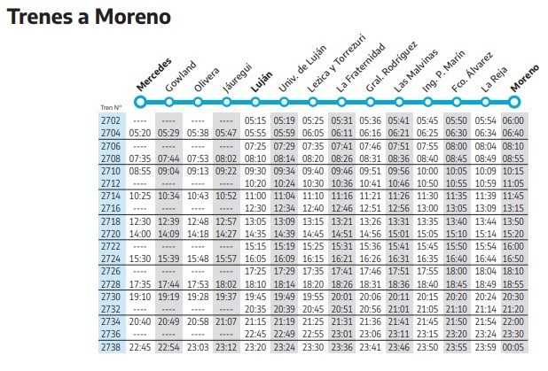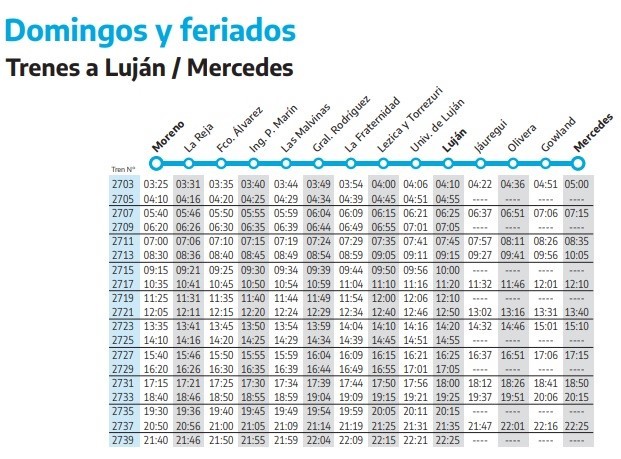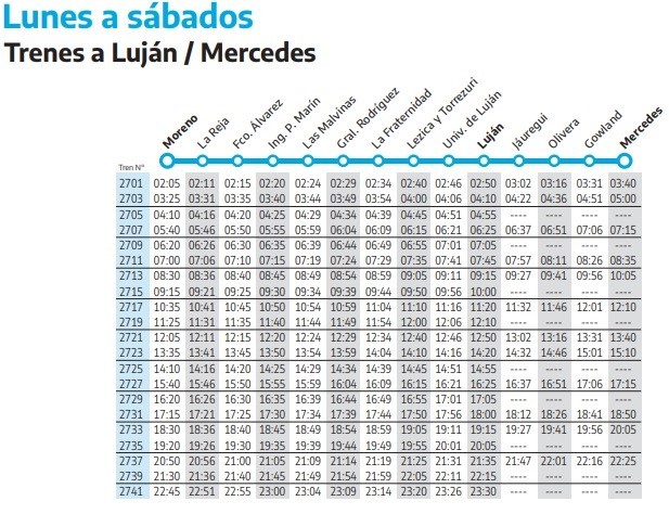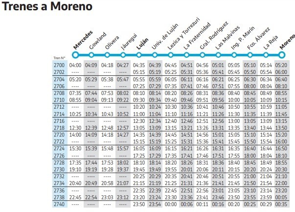 – lunes a sábado saldrán trenes desde Moreno hasta Mercedes, a las 2.05 Hs; 3.25 Hs; 5.40 Hs; 7.00 Hs; 8.30 Hs; 10.35 Hs; 12.05 Hs; 13.35 Hs; 15.40 Hs; 17.15 Hs; 18.40 Hs; y el último 20.50 Hs. Los domingos no correrá el servicio de las 2.05 Hs.