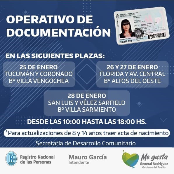 En los últimos días del mes de enero, la Secretaría de Desarrollo Comunitario de la Municipalidad de General Rodríguez, en conjunto con el Registro Nacional de las Personas, llevará adelante operativos de documentación en varios barrios del distrito.