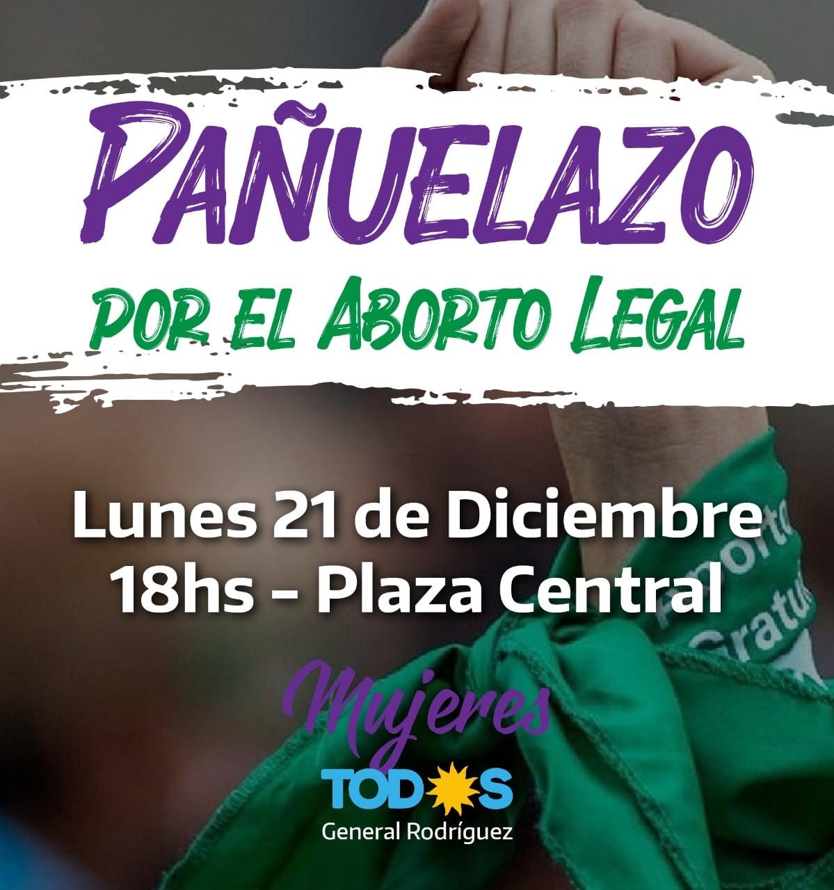 El próximo lunes, 21 de diciembre, a las 18 horas en la Plaza Central de General Rodríguez, se realizará un pañuelazo por la legalización y despenalización del aborto.