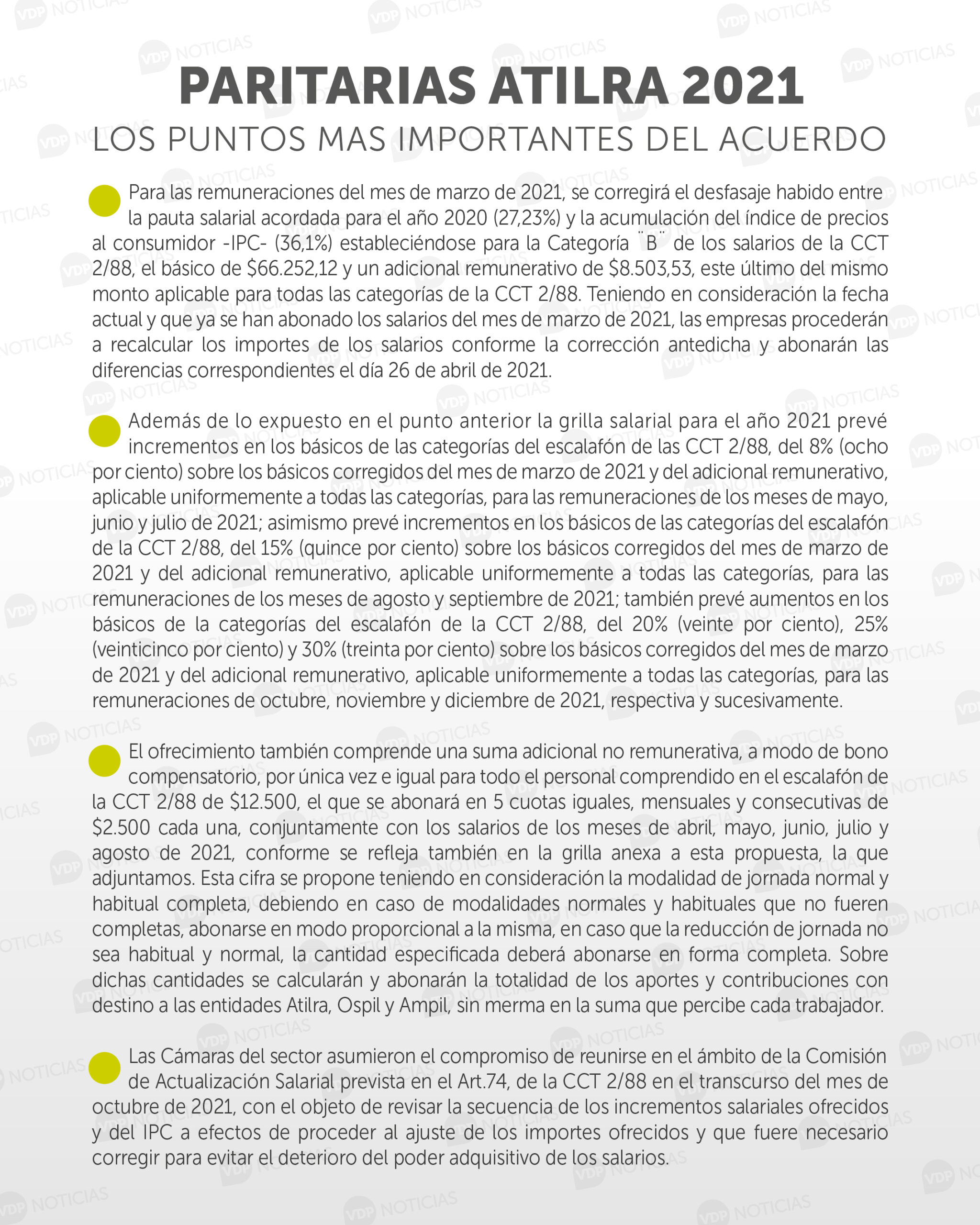 Acorde a las expectativas que tenían los trabajadores y las trabajadoras para seguir sosteniendo uno de los salarios más dignos del país, se les otorgará un incremento salarial del 30% en cuatro tramos, y un 8% adicional para recomponer hacia atrás el acuerdo logrado en 2020 (y que con esto llegó al 36,1%). Además, percibirán un bono de $12.500 por única vez y, en octubre, revisarán lo pautado adaptándolo a la afectación que hayan podido sufrir los salarios debido a la inflación y corrección de precios.