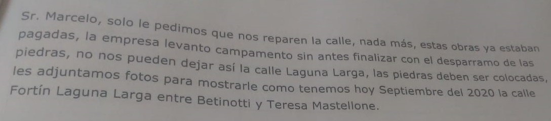 Según indicaron los vecinos y vecinas en un informe enviado el 5 de septiembre al hoy Concejal de Cambiemos, antes secretario de Obras Públicas de Kubar, Marcelo Basilotta, estaban con tres cuadras de tierra negra mezclada con tosca, que cuando llueve son imposibles de transitar, y que entre otras cosas impiden el ingreso de ambulancias y patrulleros (algo parecido a lo que tuvieron que soportar en Villa Vengochea con los famosos cordones cuneta). “La empresa levantó campamento sin antes finalizar” afirmaron en dicha nota.