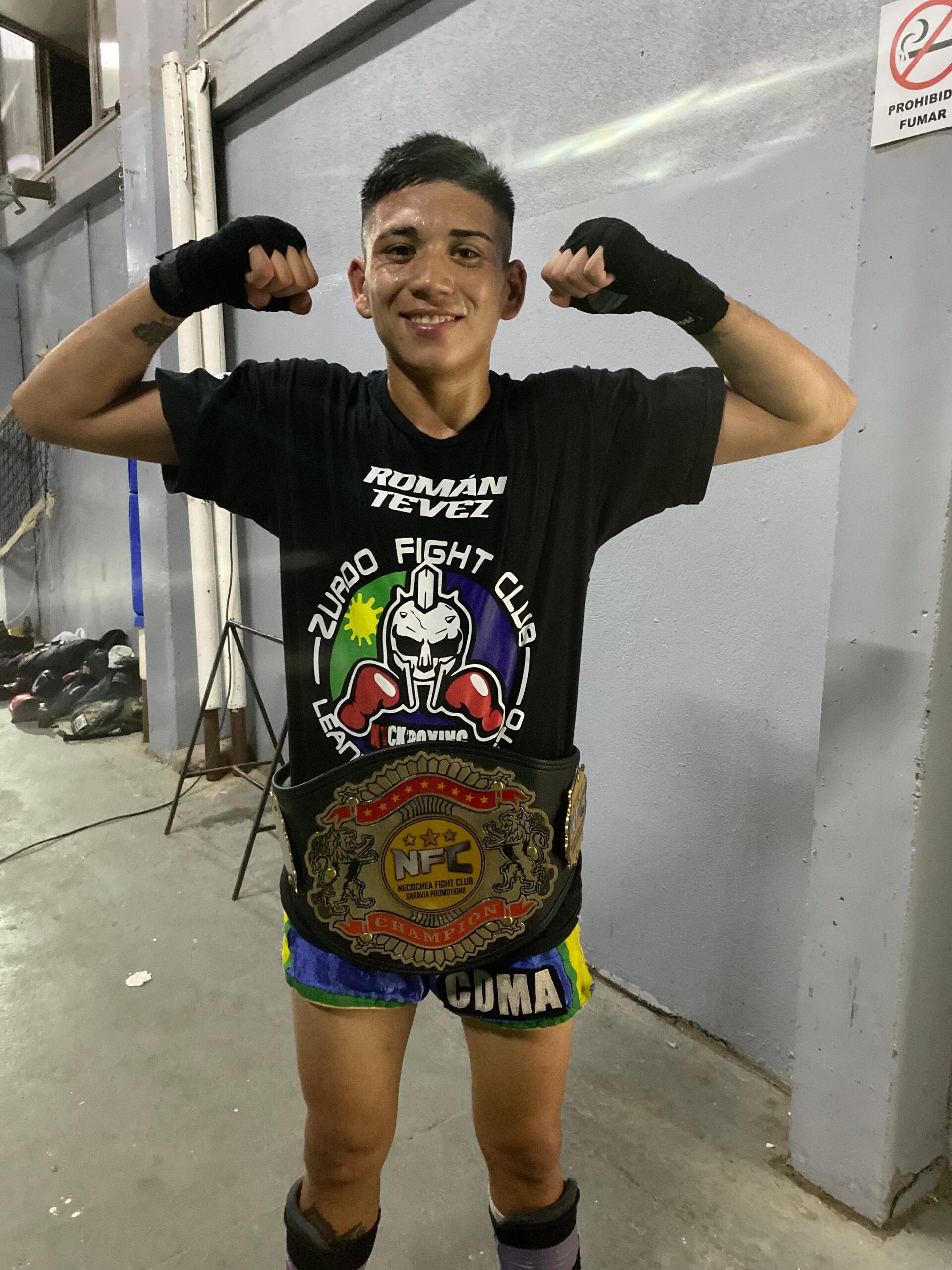 Román Tévez, de 20 años, y oriundo del barrio Villa Vengochea, fue quien también se alzó con el título de campeón argentino. Cuenta con una trayectoria de 57 peleas, 27 como amateur y 23 como semiprofesional. Sus comienzos en el kickboxing fueron cuando tenía 15 años, motivado por su madre, quien también practicaba este deporte, y su entrenador.