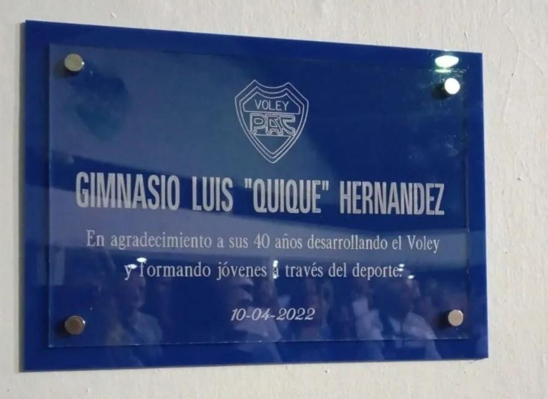En una noche emotiva llena de afectos y aplausos, se reconoció a “Quique” Hernández una plaqueta ubicada en la puerta del gimnasio, el cual ya lleva su nombre. La placa de color azul hace alusión a sus 40 años desarrollando el vóley y formando jóvenes a través del deporte.