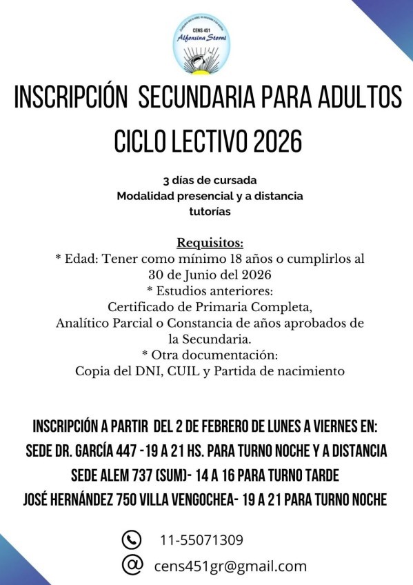 Para consultas, la institución puso a disposición el teléfono 11-5507-1309 y el correo cens451gr@gmail.com