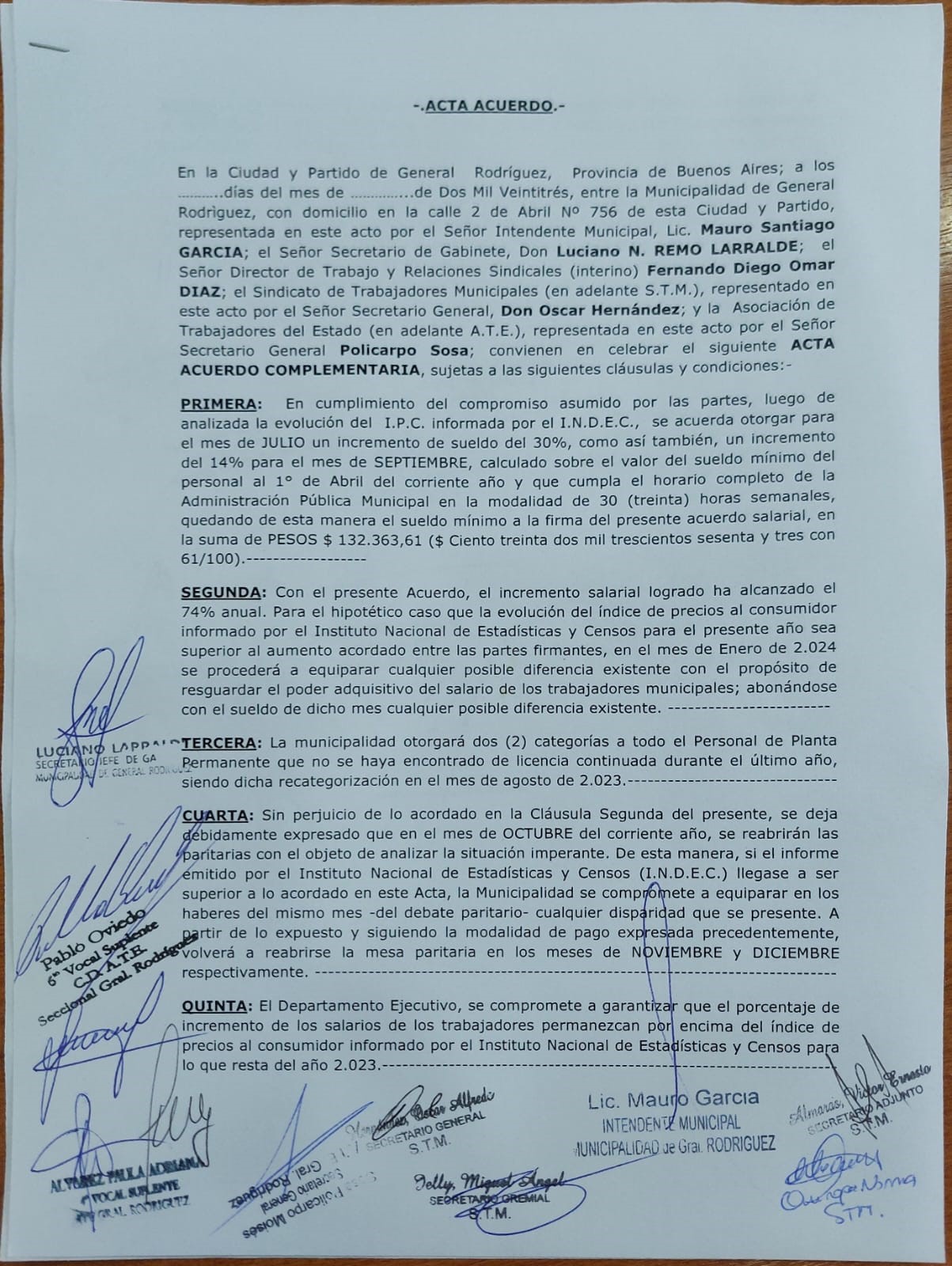El acuerdo, firmado en el Salón Garrahan del Municipio, dado a conocer por la Municipalidad de General Rodríguez a través de sus redes sociales, también incluye en sus artículos la aclaración de que se dé el hipotético caso de que el índice de precios al consumidor informado por el Instituto Nacional de Estadísticas y Censos (Indec) para el presente año sea superior al aumento acordado entre las partes firmantes, en el mes de enero del 2024 se procederá a equiparar cualquier posible diferencia existente con el propósito de resguardar el poder adquisitivo del salario de los trabajadores municipales.