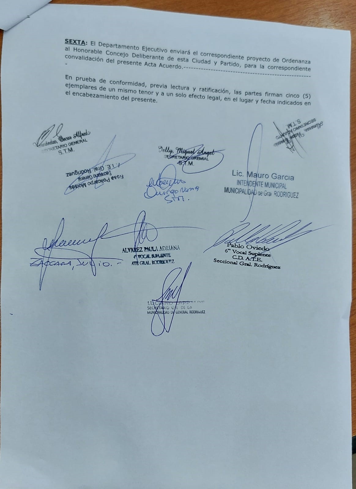 El convenio de Acta Acuerdo Complementaria, se celebró en el Salón Garrahan de la Municipalidad, con las firmas del intendente Mauro García; el secretario Jefe de Gabinete, Luciano Larralde; el director de Trabajo y Relaciones Sindicales, Fernando Díaz y por los gremios lo hicieron sus secretarios generales; de ATE: Policarpo Sosa y por el STM, Oscar Hernández.