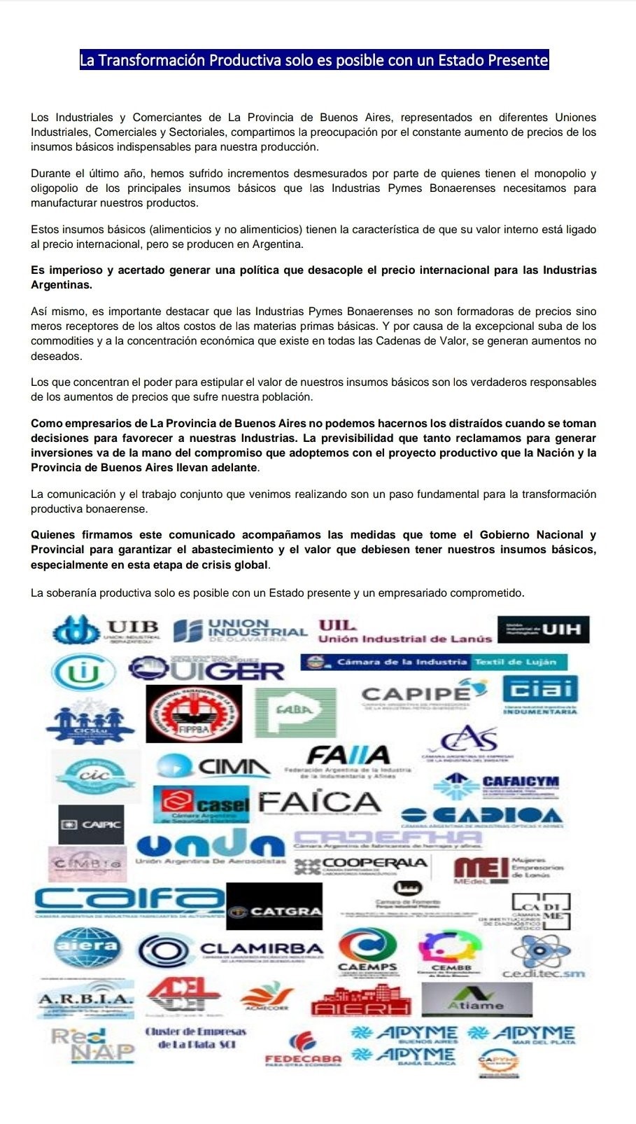 El comunicado, fue firmado por unas treinta entidades entre las que sobresalen la Cámara de la Industria Argentina de la Indumentaria, la cámara de industriales del Calzado, la Federación de Industriales Panaderos de la Provincia, la Unión Industrial de Olavarría, la Unión Industrial de Berazategui, la Cámara de Manufacturas de Cuero y la Unión Industrial de General Rodríguez.