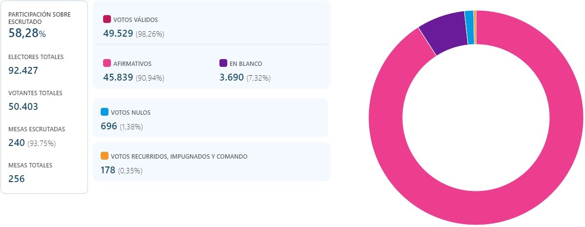 De un total de 92.427 electores habilitados, votaron 50.403. Hubo 49.529 votos válidos (45.839 afirmativos y 3.690 en blanco), 696 nulos y 178 recurridos e impugnados.