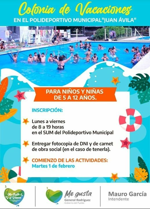 A partir de este jueves 27 de enero, de 8 a 19 hs, está abierta la inscripción en el SUM del Polideportivo Municipal, para la colonia de vacaciones para niños y niñas de entre 5 y 12 años.