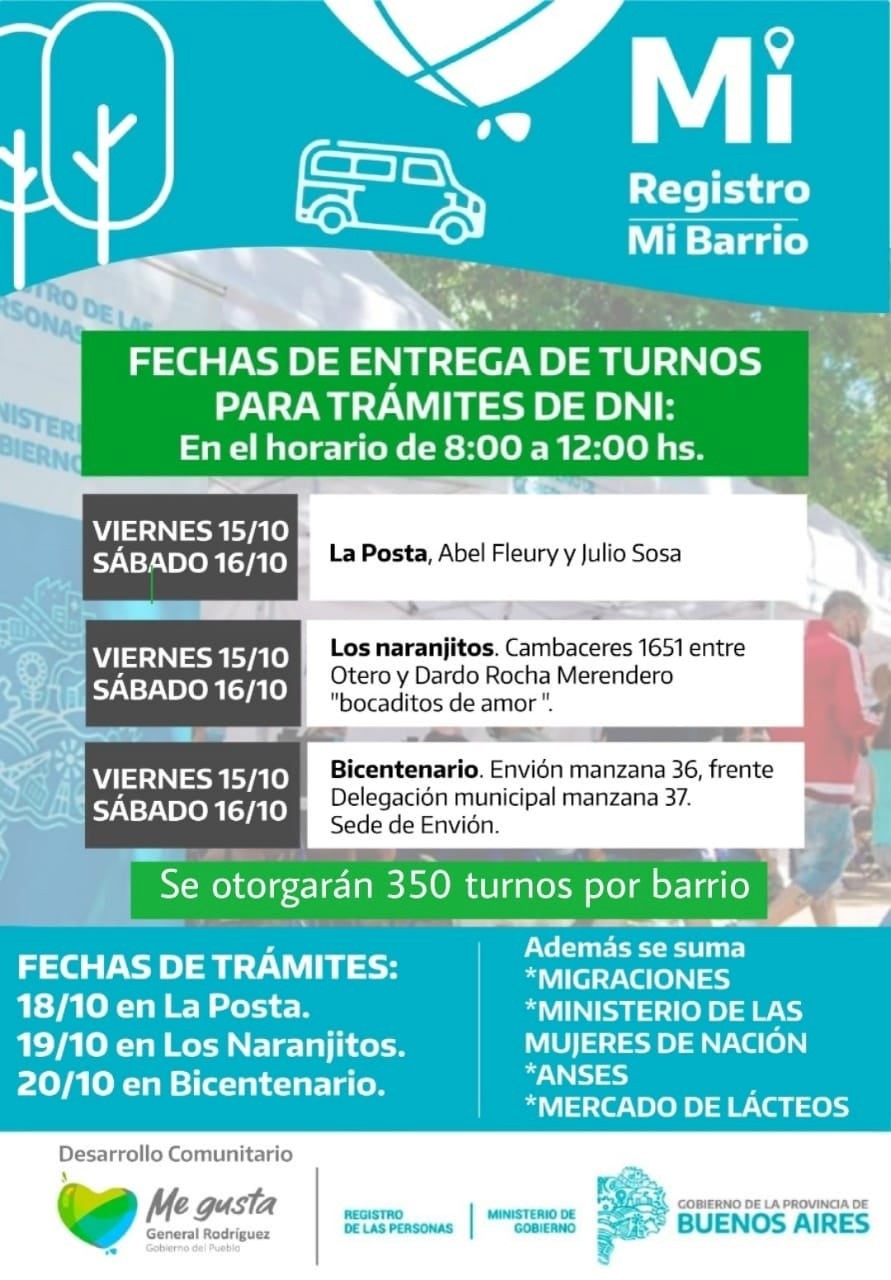 El Municipio realizará una nueva entrega de turnos a vecinas y vecinos de General Rodríguez para que puedan tramitar el DNI a través del programa “Mi Registro, Mi Barrio”.