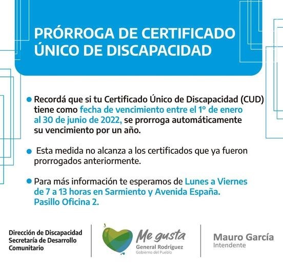 La Dirección de Discapacidad municipal, dependiente de la Secretaría de Desarrollo Comunitario, informó que todos los que posean Certificado Único de Discapacidad (CUD) y cuyo vencimiento se encuentre entre el 1° de enero y el 30 de junio de 2022, se extenderá automáticamente su vigencia por el plazo de un año.