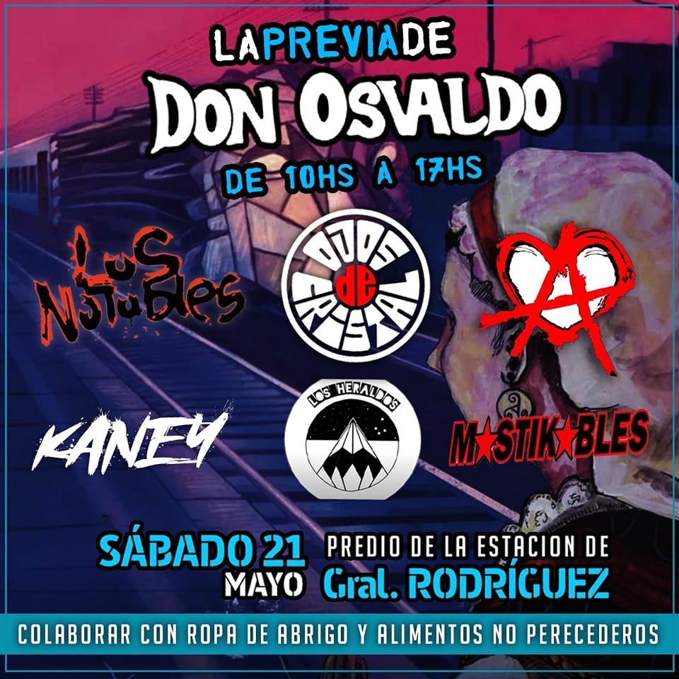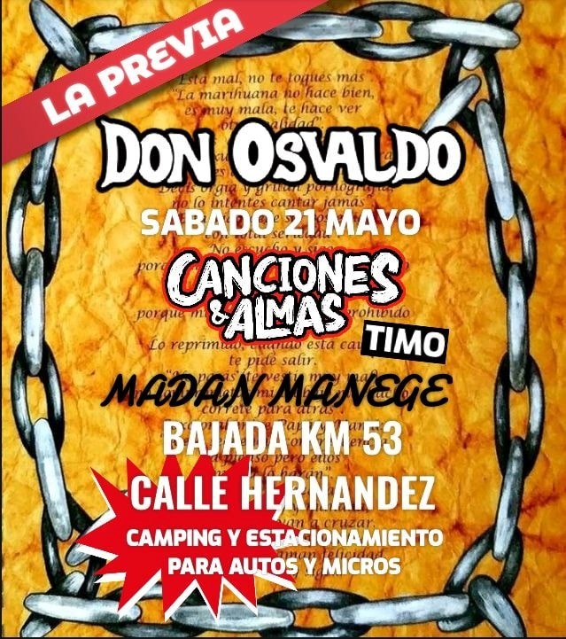“La Municipalidad de General Rodríguez informa a su población, que durante los días Sábado 21 y Domingo 22 de Mayo, se realizará en las instalaciones de la cancha del Club Mutual Deportivo Leandro Nicéforo Alem, el recital en vivo del Grupo de rock «Don Osvaldo»