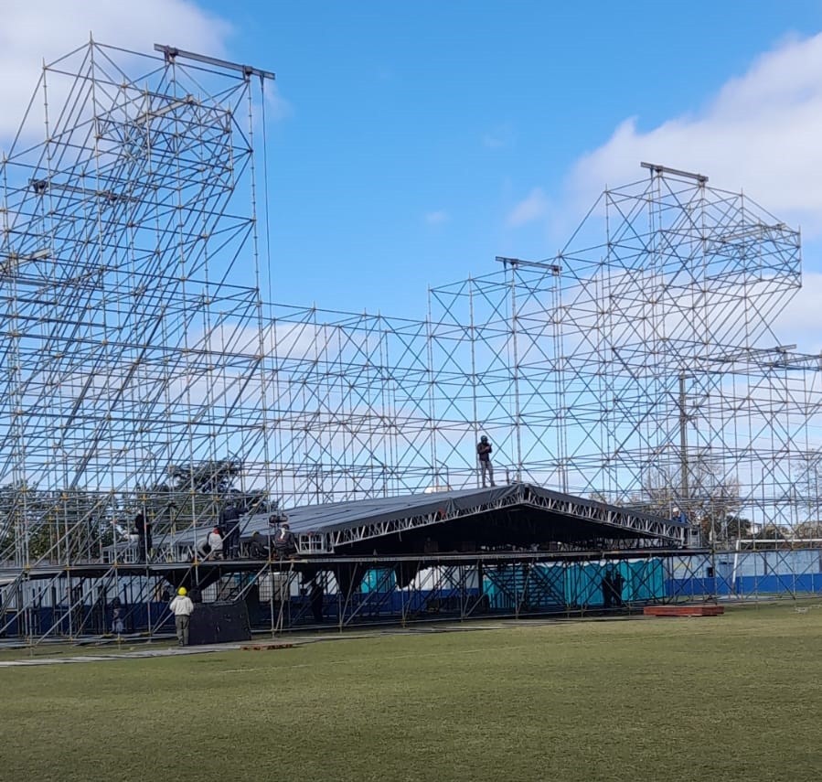Los trabajos previos para el evento comenzaron en el Estadio lunes 16 de mayo, con el armado del imponente escenario que estará ubicado en la cancha a espaldas del paredón que da a la calle Almirante Brown, mirando hacia la calle Liniers.