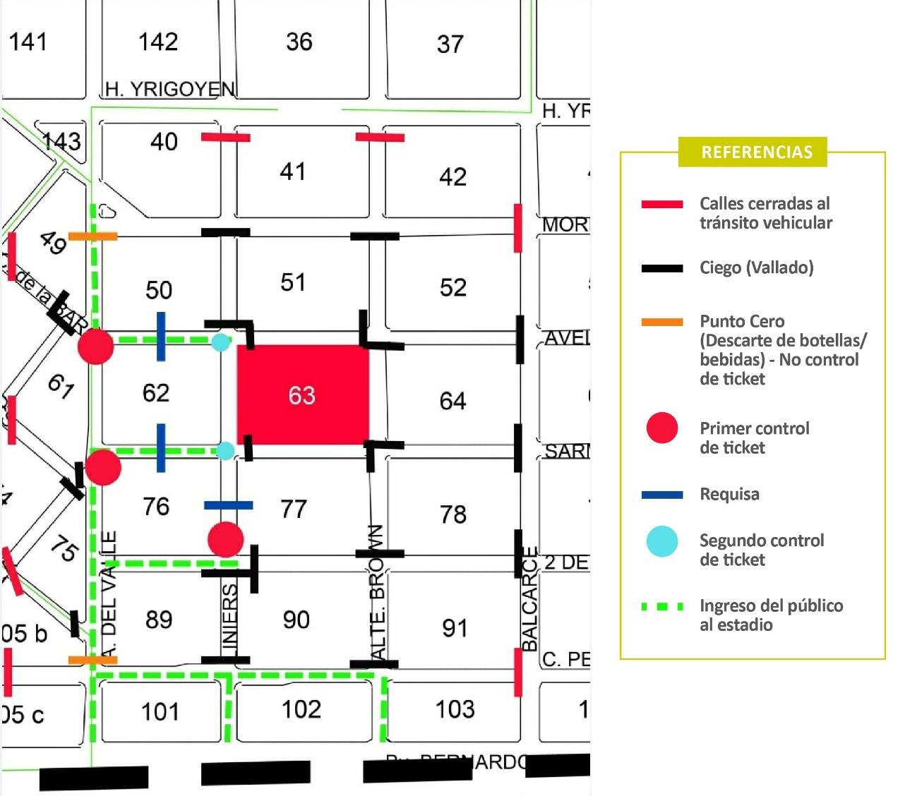 El perímetro cerrado al tránsito vehicular estará determinado en las calles que rodean el estadio, Bernardo de Irigoyen, Balcarce, Hipólito Yrigoyen, Calderón de la Barca, Cervantes, José Artigas, Azcuénaga, y Carlos Pellegrini.